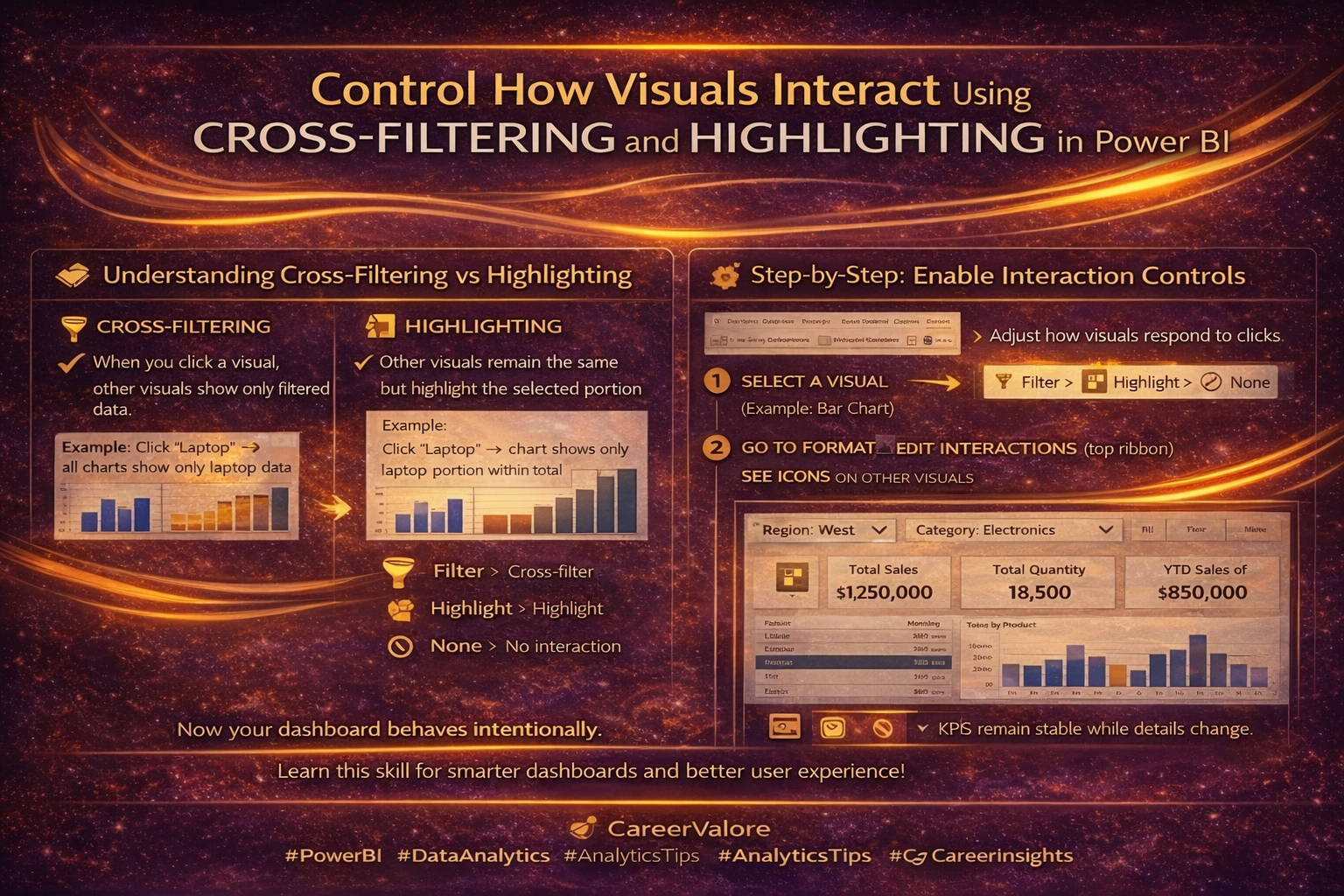 Understanding interactions helps you build predictable and professional dashboards.