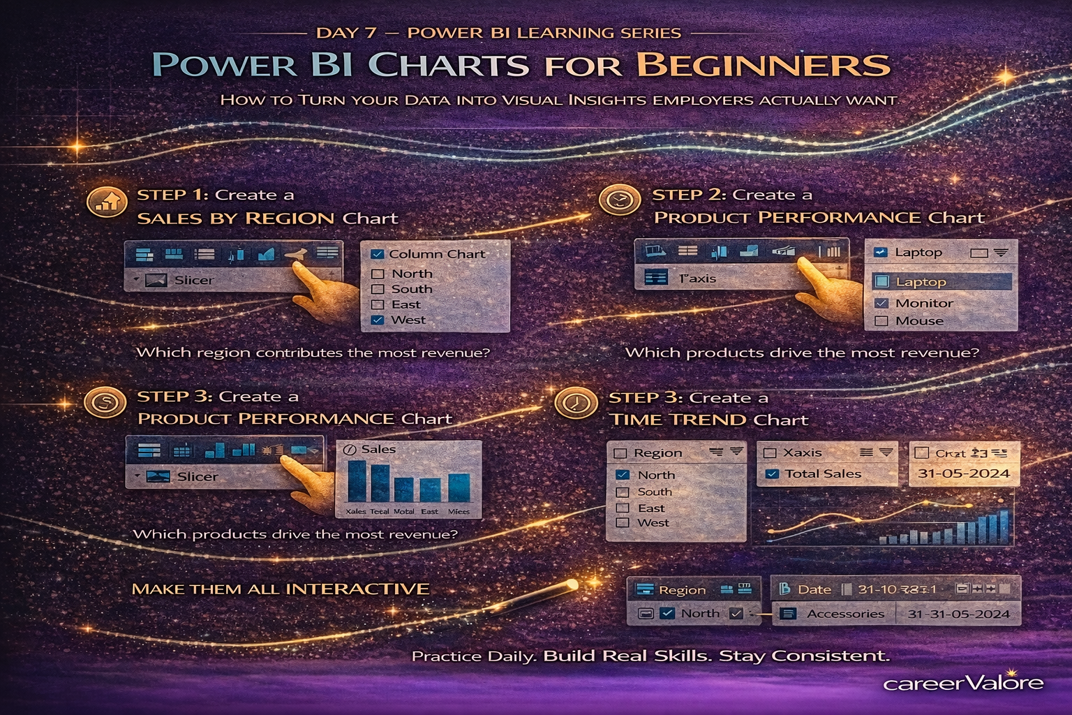 In Day 7, you will learn how to create meaningful charts that explain the story behind your data, not just decorate your report.